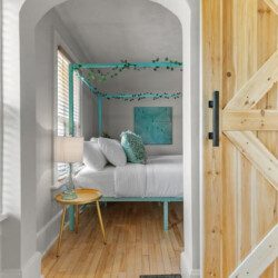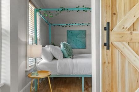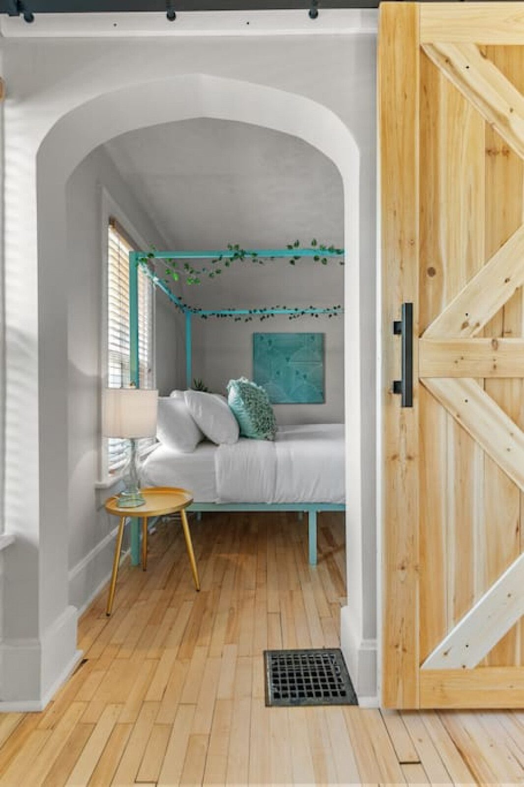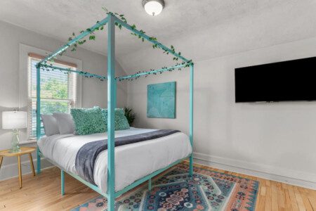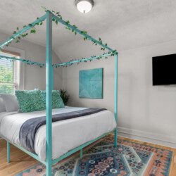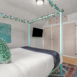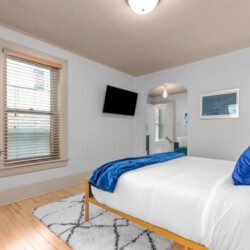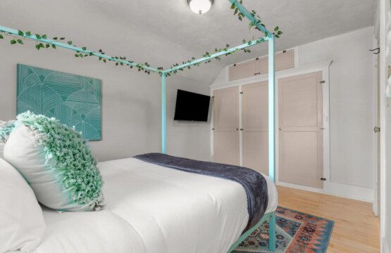 Bedroom 4: Upstairs. Queen bed; 43″ Roku TV. Closet for storage. Barn door separates Bedroom 4 from Bedroom 5.