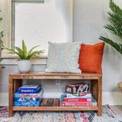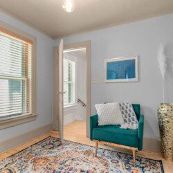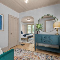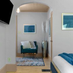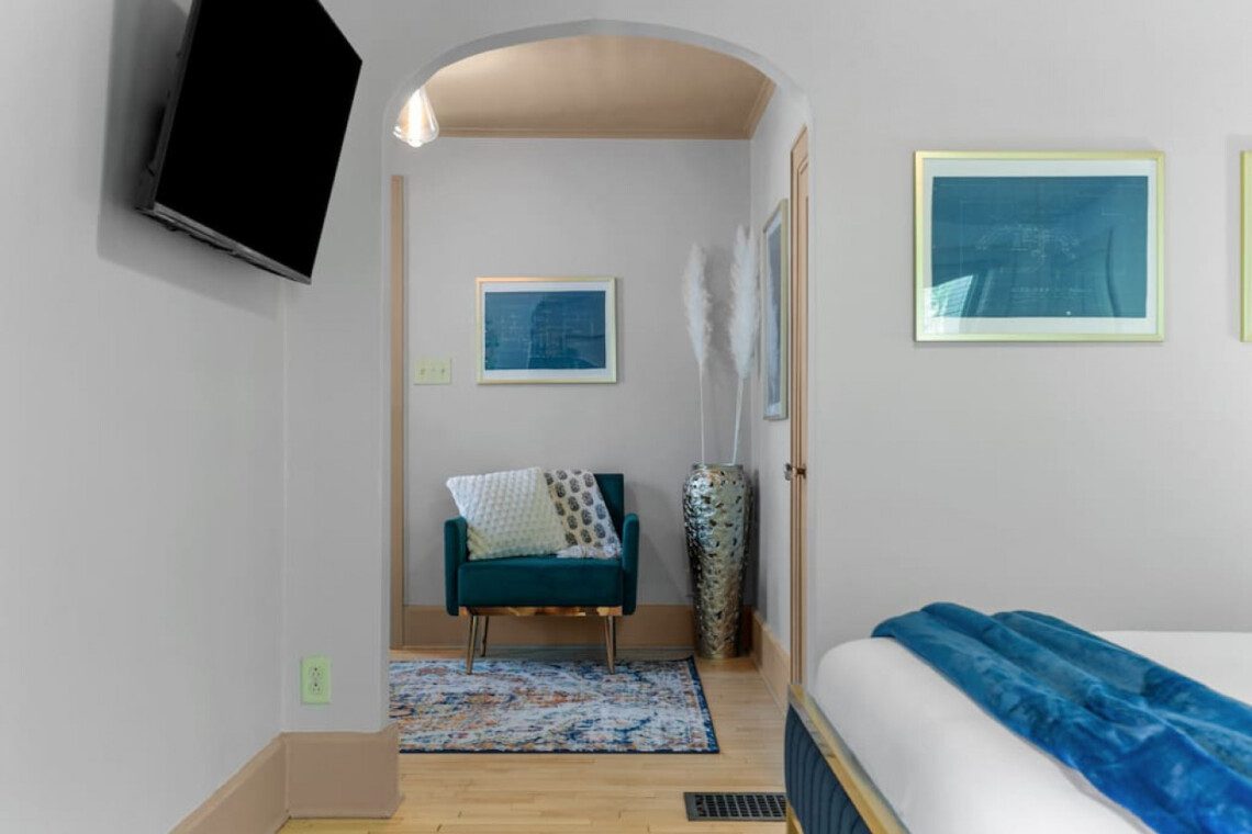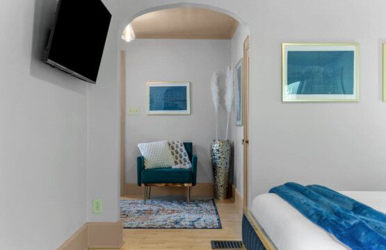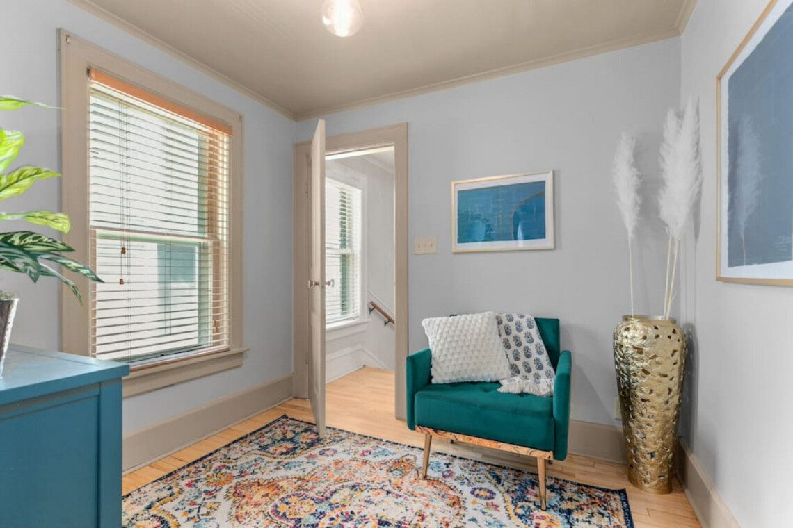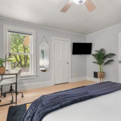 Bedroom 2: Upstairs. Queen bed; 43″ Roku TV. Dresser and closet for storage. Additional parlor seating area attached to bedroom.