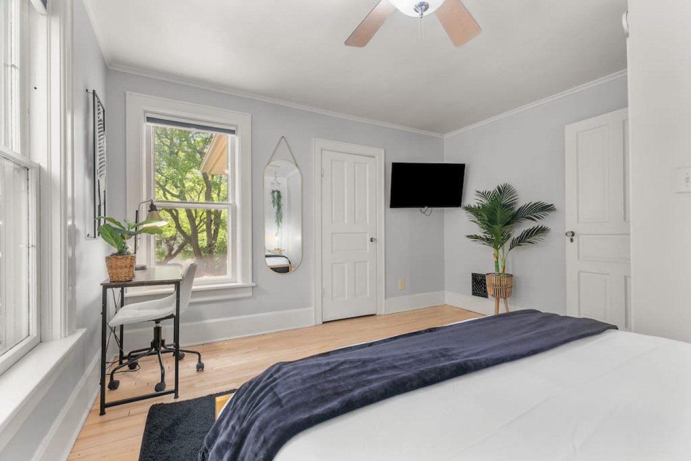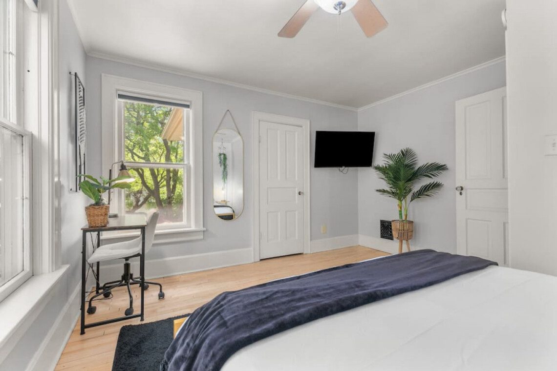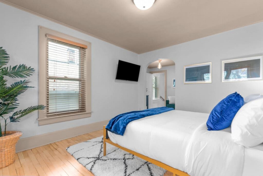 Bedroom 1: Located on the first floor off the dining area. Queen bed. Attached half bathroom through closet under stairway. 43″ Roku TV. Closet for storage.