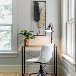 Bedroom 3: Upstairs. Queen bed; 43″ Roku TV. Workspace with desk, chair, and lamp located in bedroom. Closet for storage.