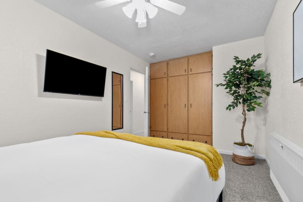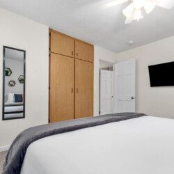 Bedroom 3: Queen bed with new memory foam mattress. 43″ Roku TV. Closet for storage.