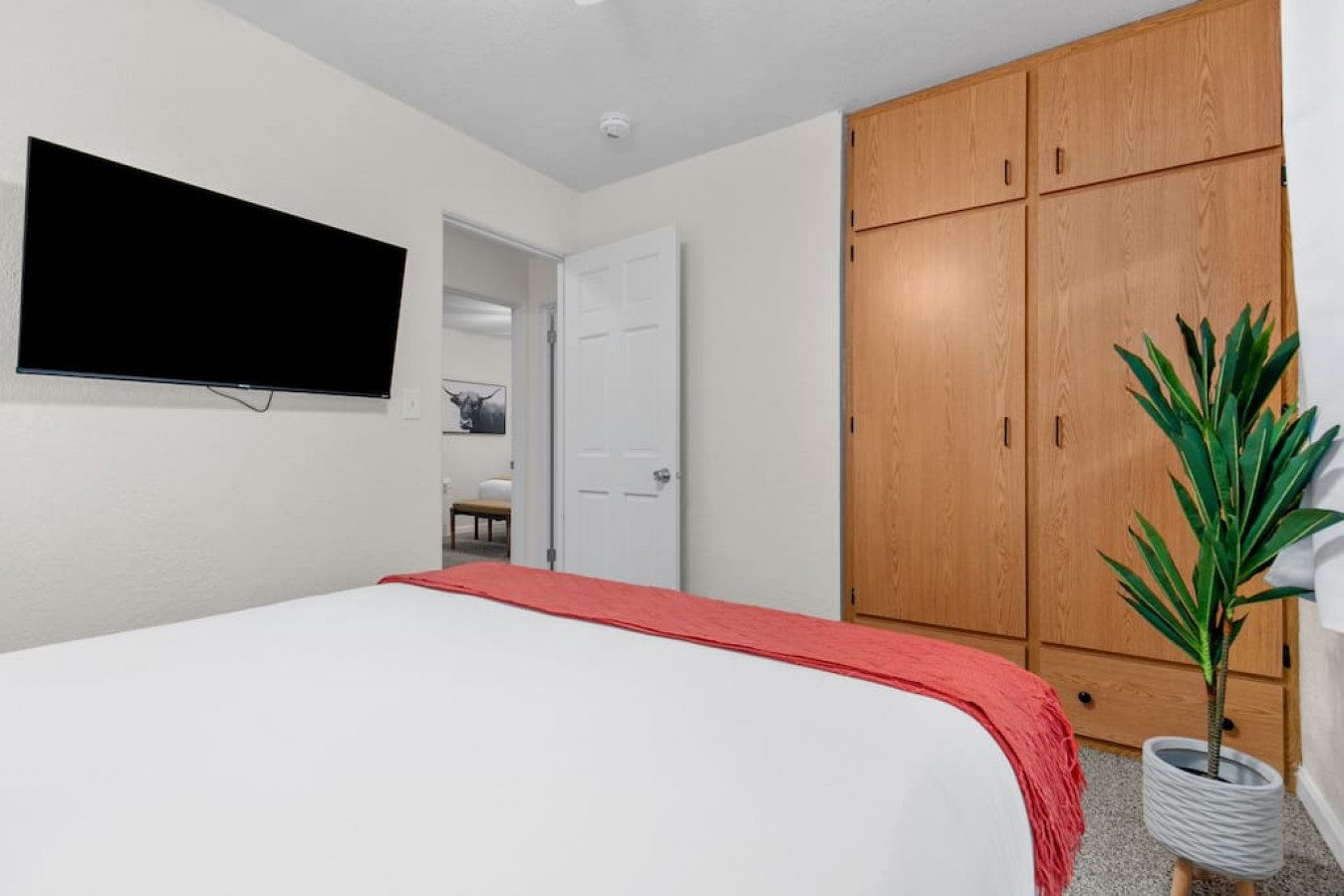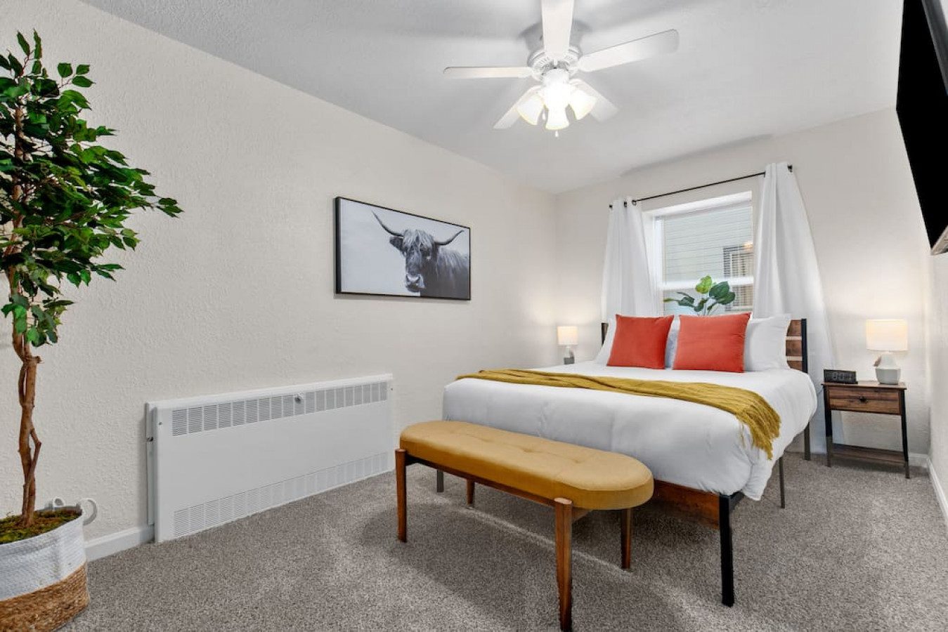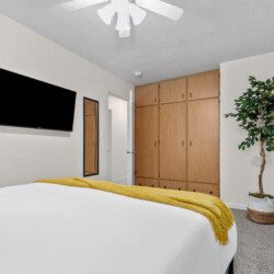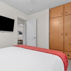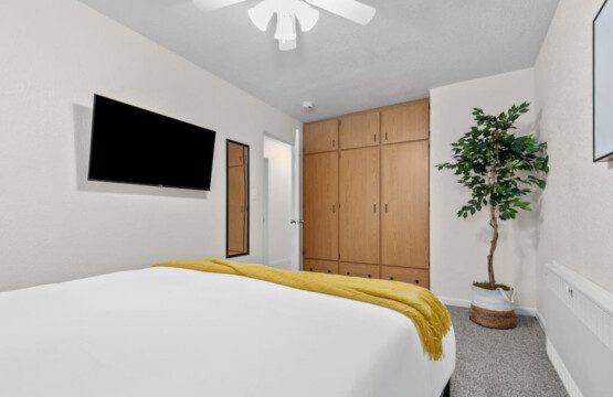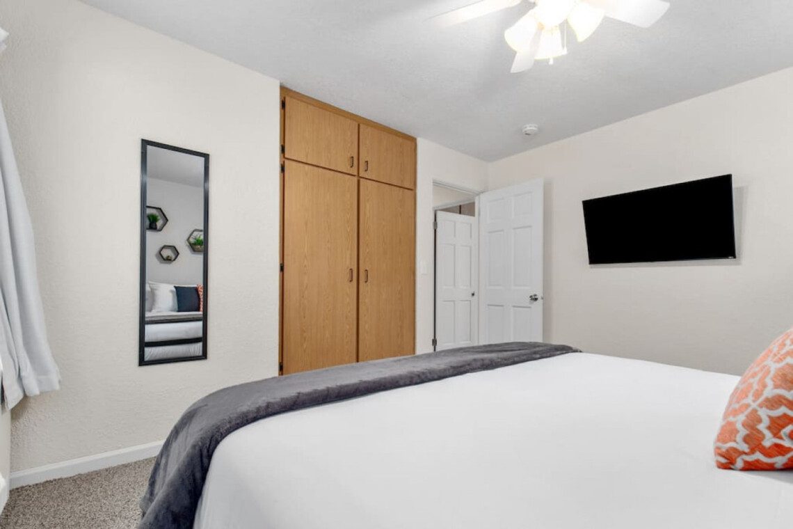 Bedroom 1: King bed with new memory foam mattress. 43″ Roku TV. Closet for storage.