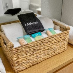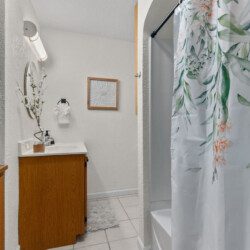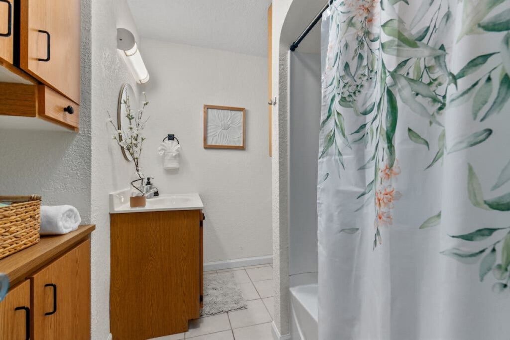 Full bathroom stocked with shampoo, conditioner, and body wash. A starter supply of toilet paper is also provided.