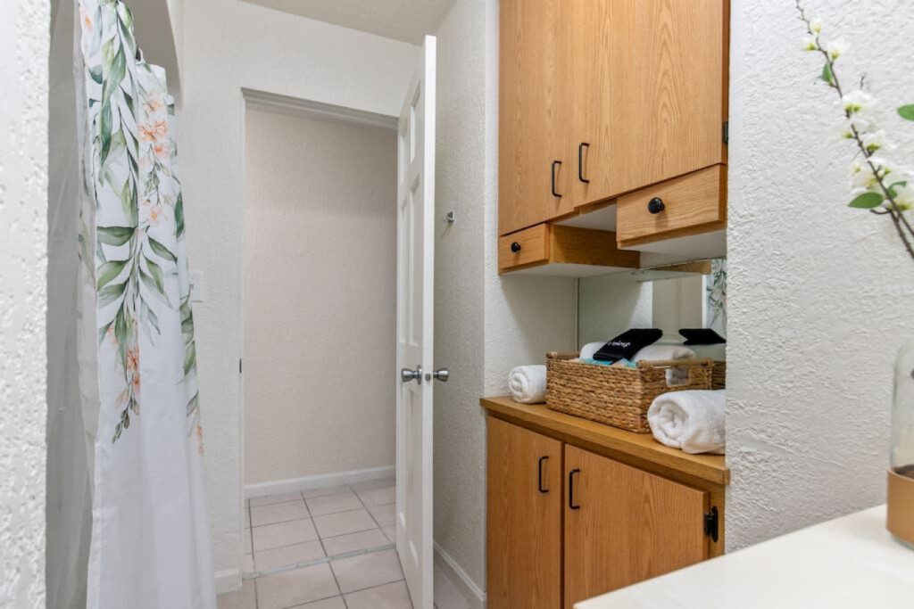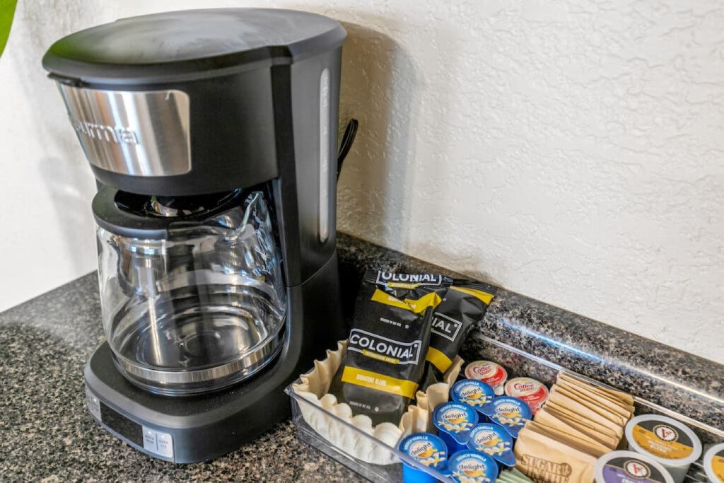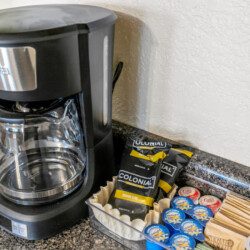 Enjoy your morning beverage of choice at the coffee and tea bar! A coffee maker and Keurig are available. We provide a starter set of ground coffee, k-cups, tea, creamer, sugar and stevia.