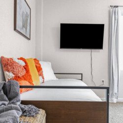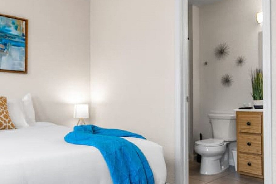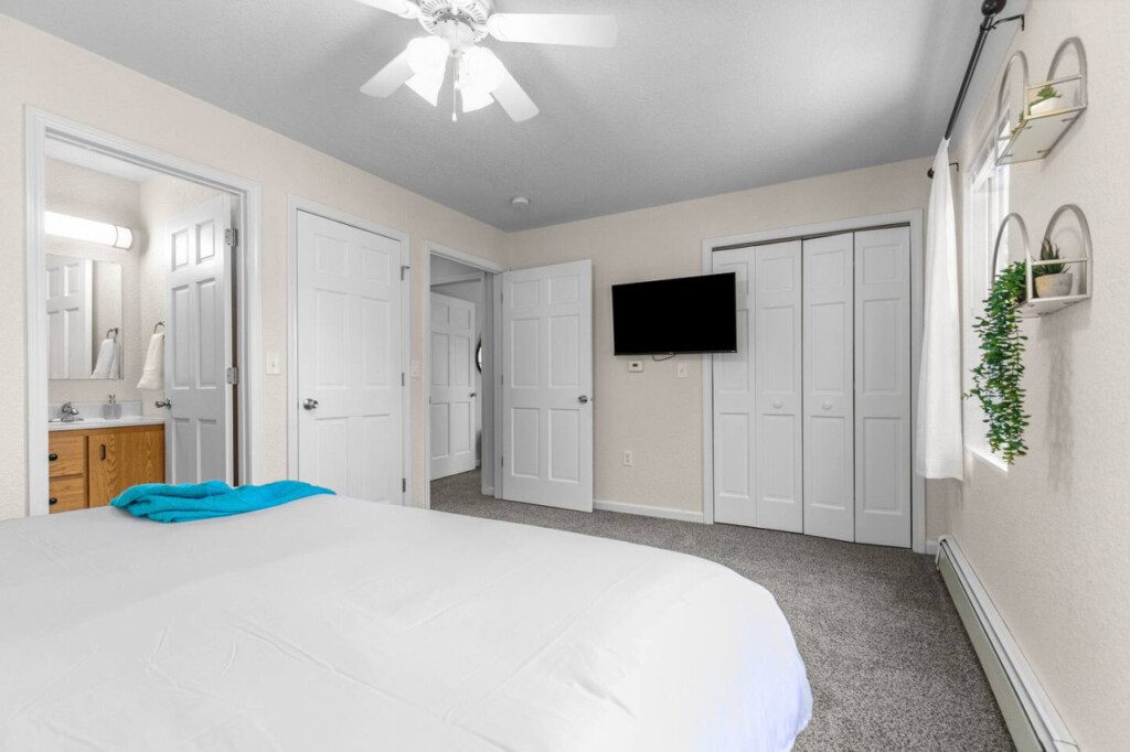 Bedroom 1 (master): King bed with new memory foam mattress. 43″ Roku TV. Closet for storage. Attached full bathroom stocked with shampoo, conditioner and body wash. Makeup towels and a hair dryer are available.