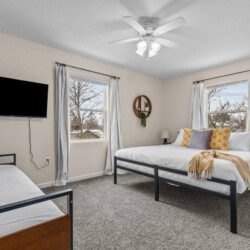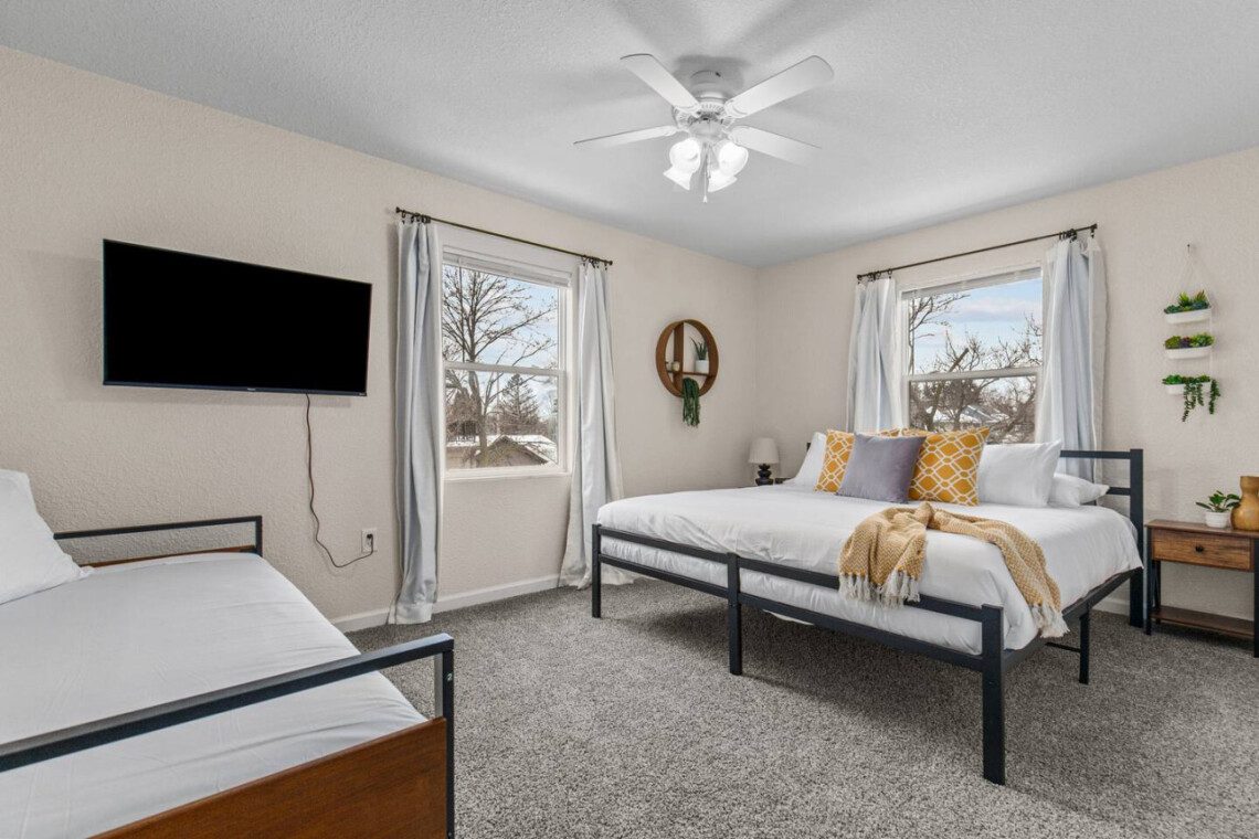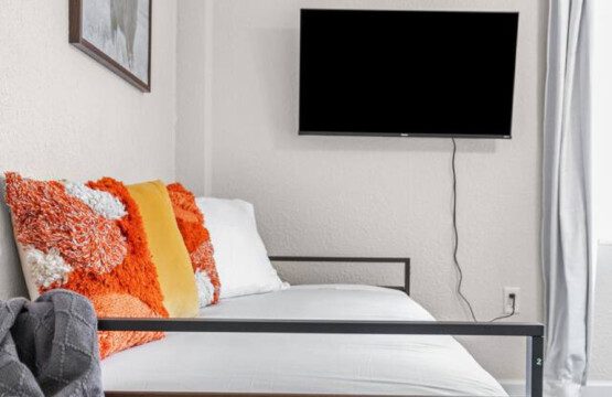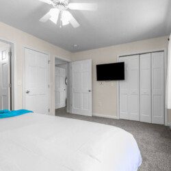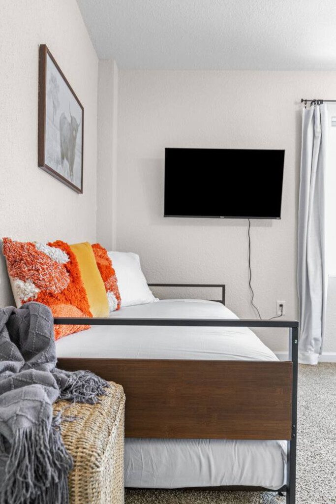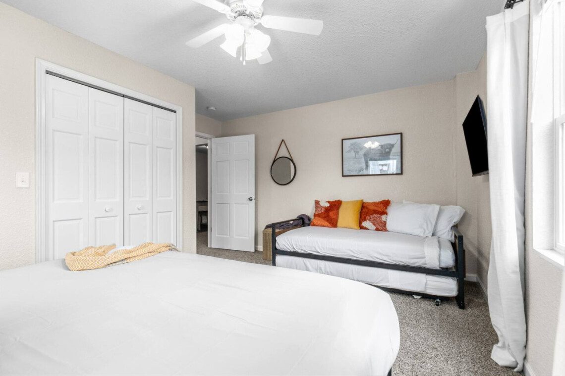 Bedroom 3: King bed with new memory foam mattress. Additional twin trundle bed with a removable base is located in this room. 43″ Roku TV. Closet for storage.