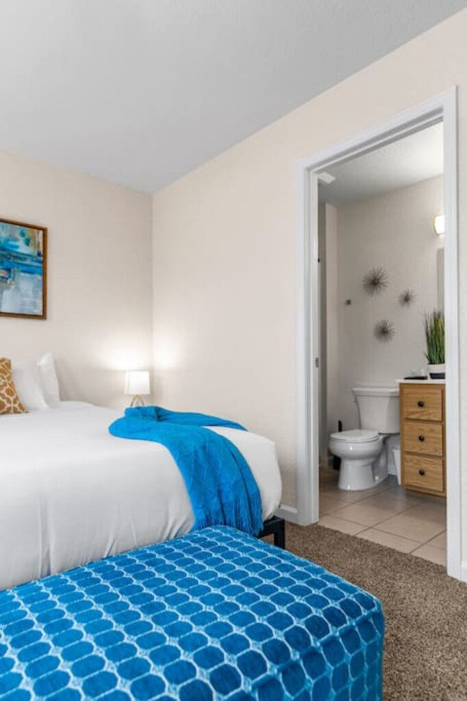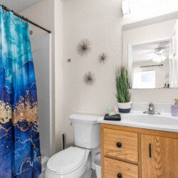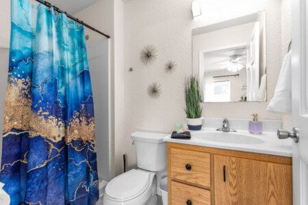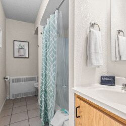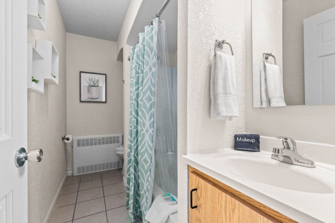 Second full bathroom with bathtub/shower. Bathroom is stocked with shampoo, conditioner and body wash. Makeup towels and a hair dryer are available.