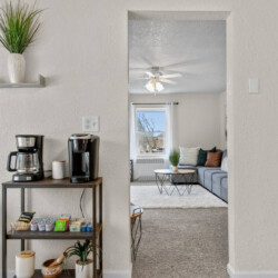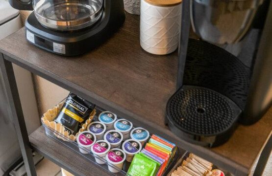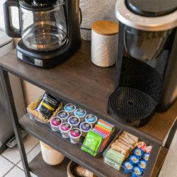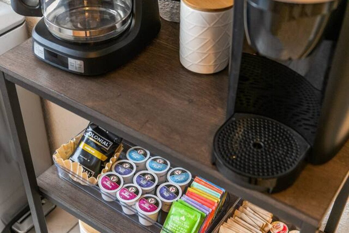 Enjoy your morning beverage of choice at the coffee and tea bar! A 12 cup coffee maker and Keurig are available; we provide a starter set of ground coffee, k-cups, tea, creamer, sugar and stevia.