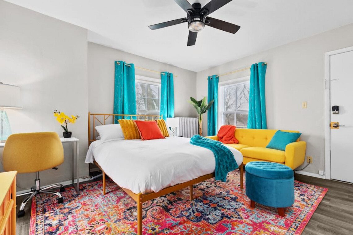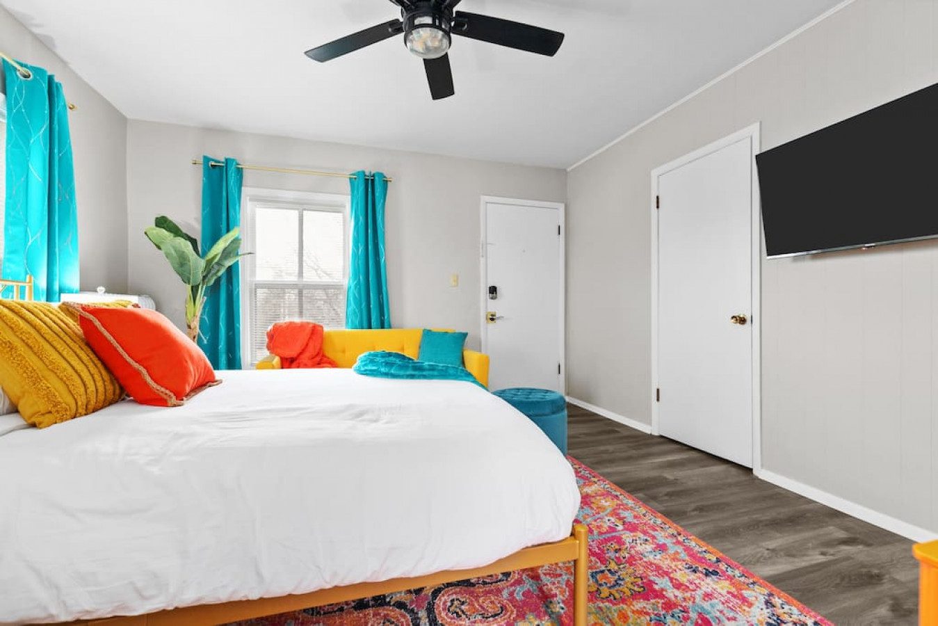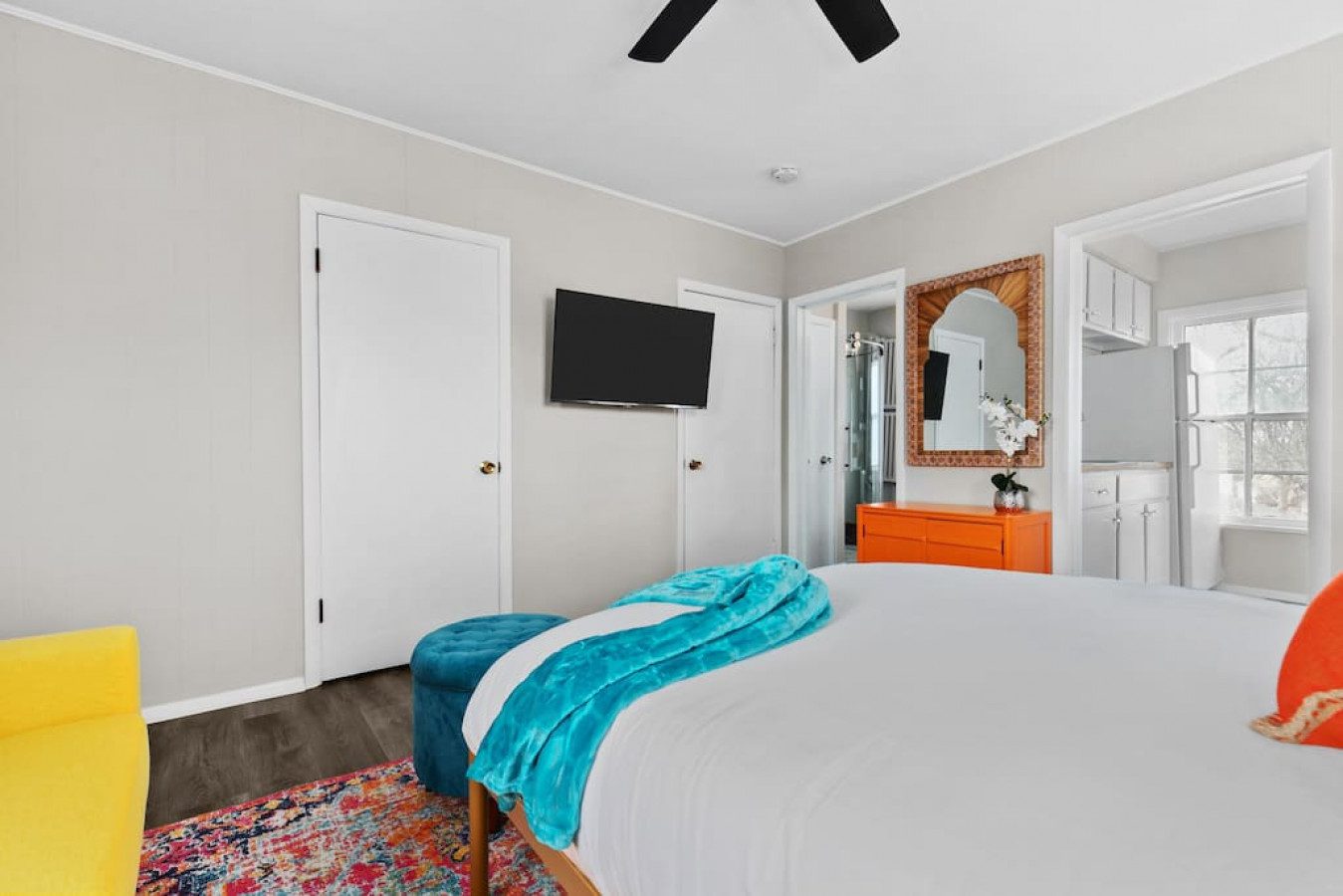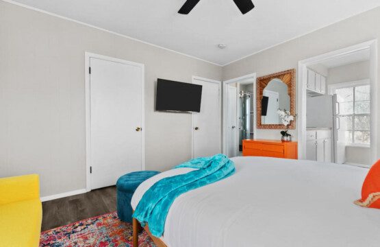 Studio with a new memory foam queen mattress. The 43″ Roku Smart TV is setup in guest mode for you to login to your preferred streaming services! Room darkening shades for daytime sleep!