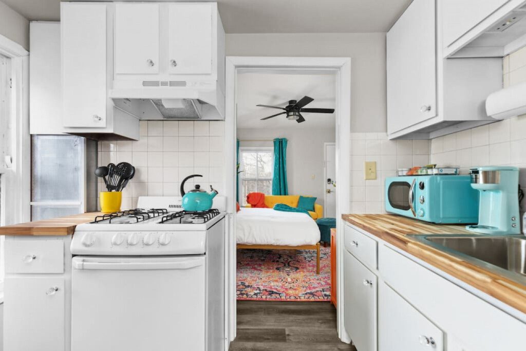 Bring out your inner chef in the fully stocked kitchen using the Greenware pots & pans and silicone utensils. A starter supply of paper towels and dish soap are provided. The dining area has a bistro table with 2 chairs.