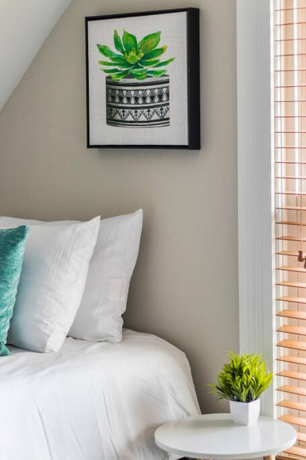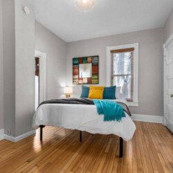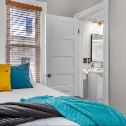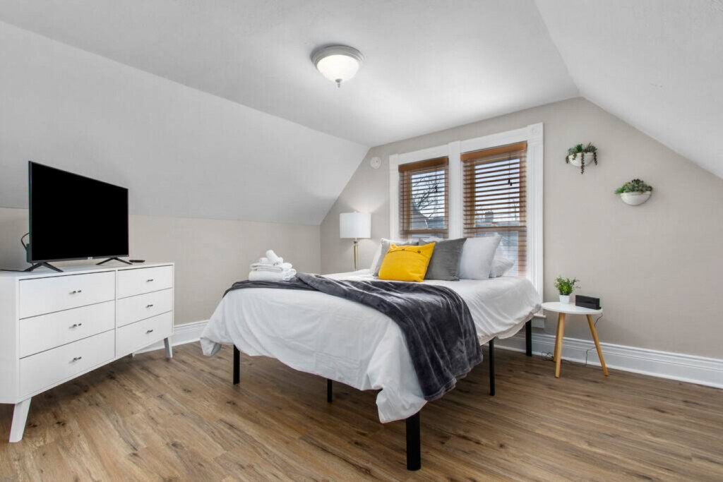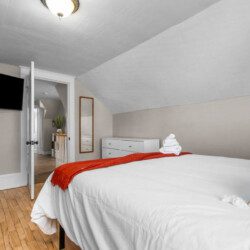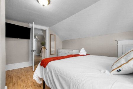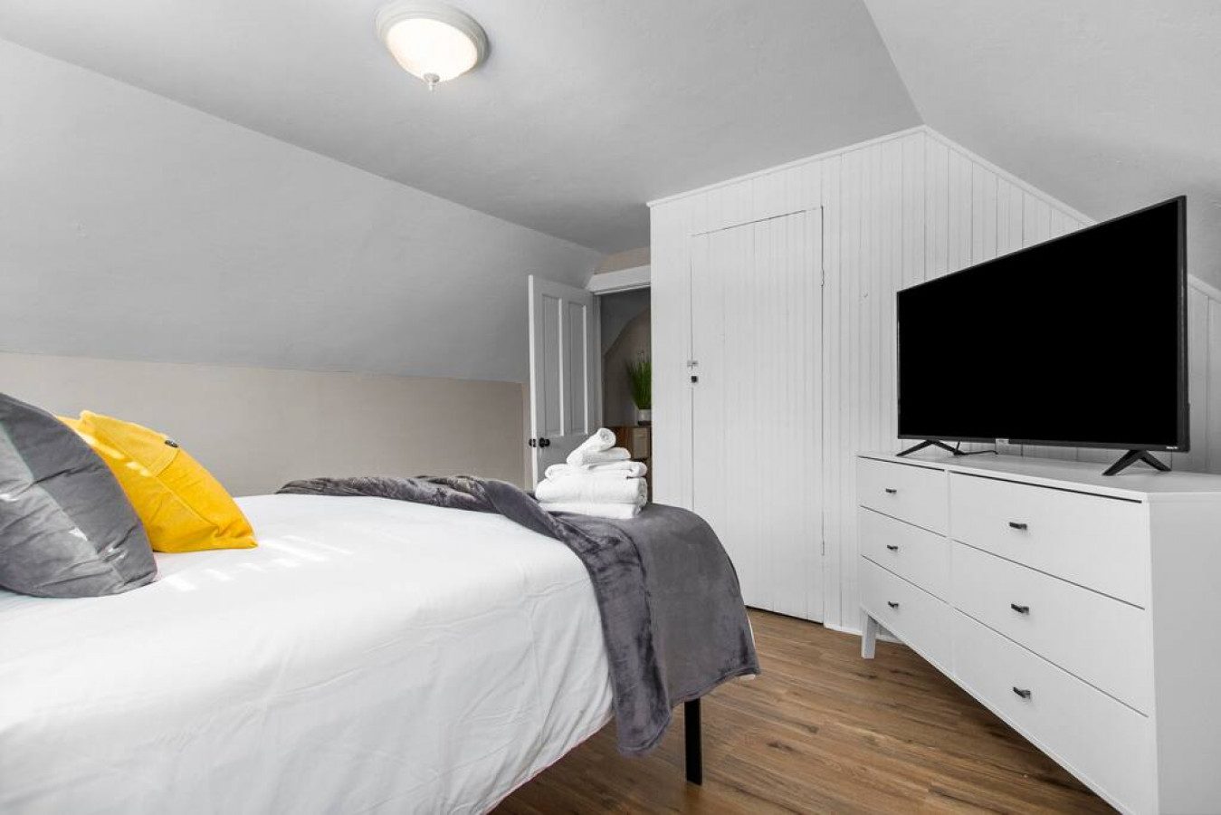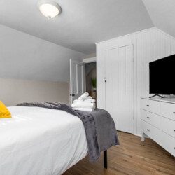 Master Bedroom: located on the first floor off the entry way. Attached full bathroom with stand-up shower. Queen bed, 43″ Samsung Smart TV. Dresser and closet for storage.