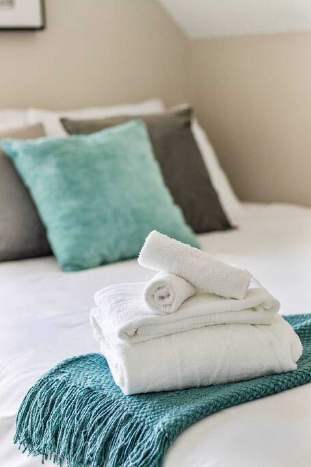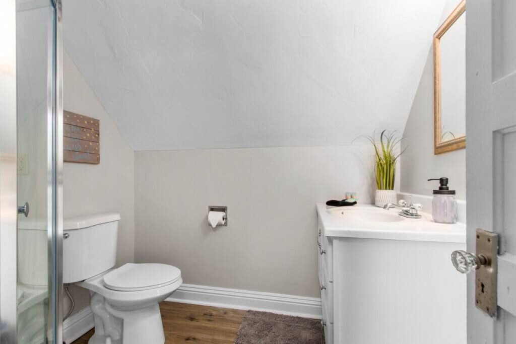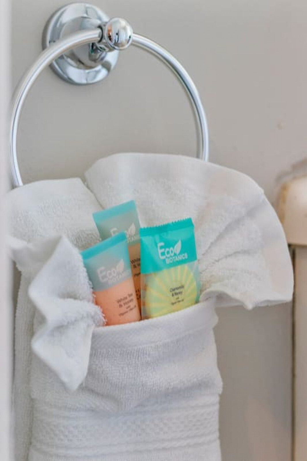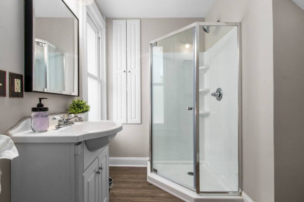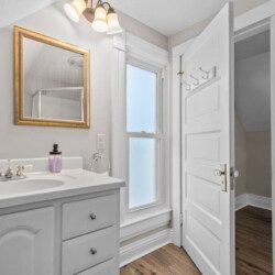 Second full bathroom with stand-up shower is upstairs. Both bathrooms are stocked with shampoo, conditioner and body wash. Makeup towels are available in both bathrooms along with hair dryers. All bedrooms include additional towel hooks as bathrooms have limited space for drying towels.