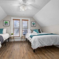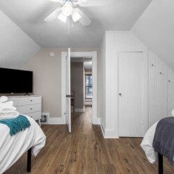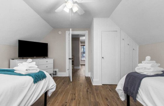 Bedroom 3: Upstairs. Queen bed and twin bed, 43″ Roku TV. Dresser and closet for storage. Additional towel hooks are available in bedroom.