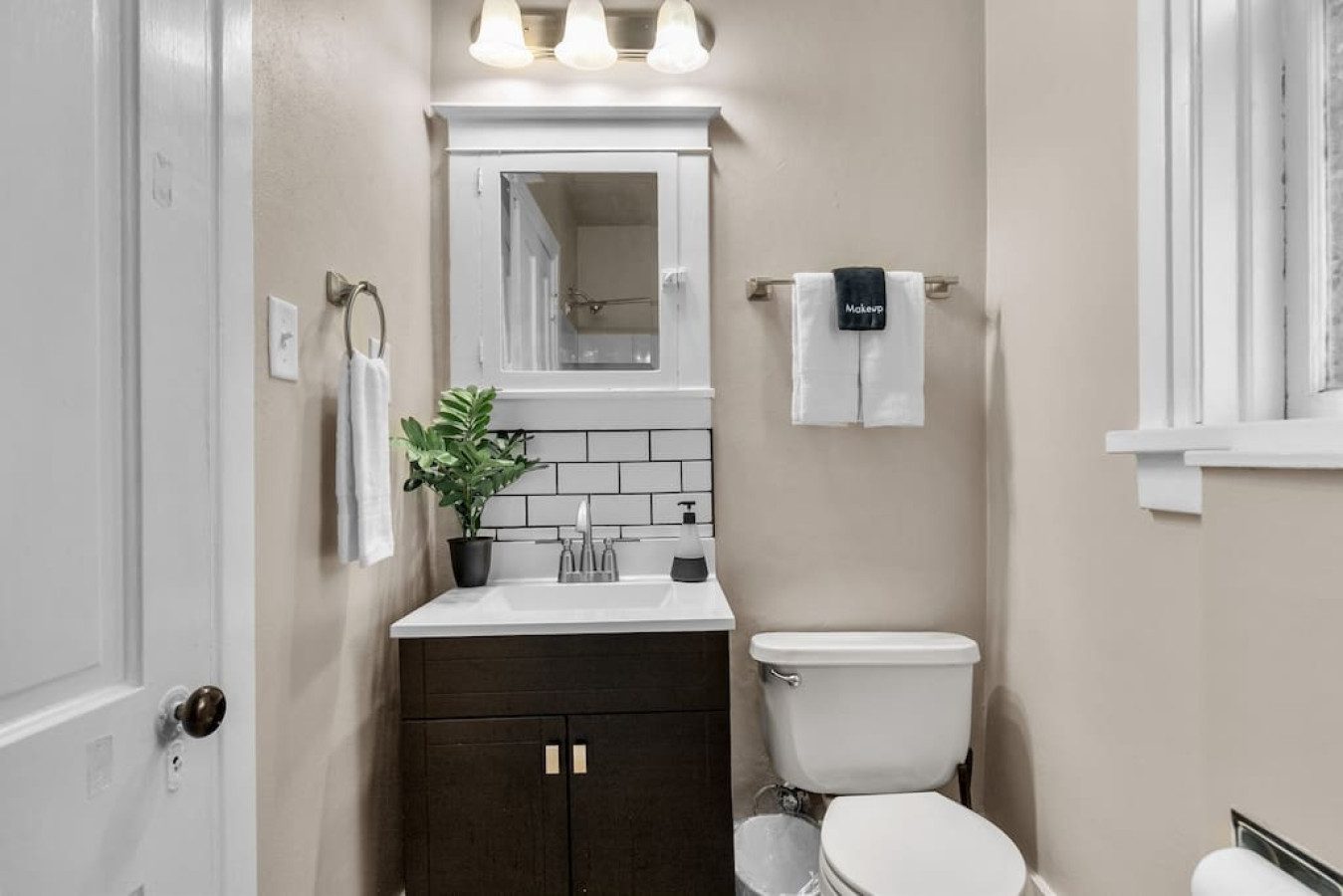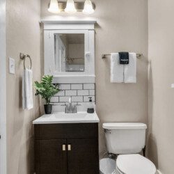 Bathroom is stocked with a starter set of shampoo, conditioner, and body wash. A starter supply of toilet paper is also provided. Makeup towels are available along with a hair dryer.