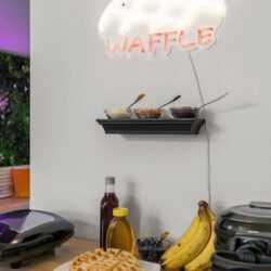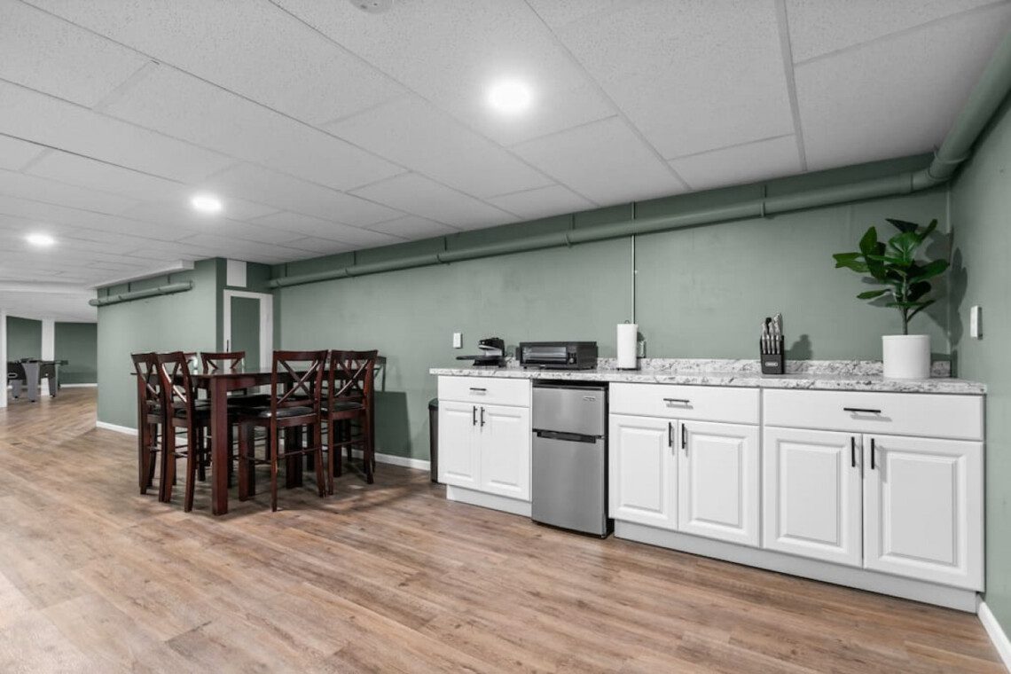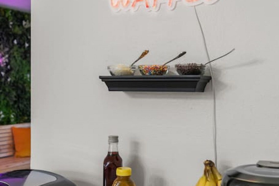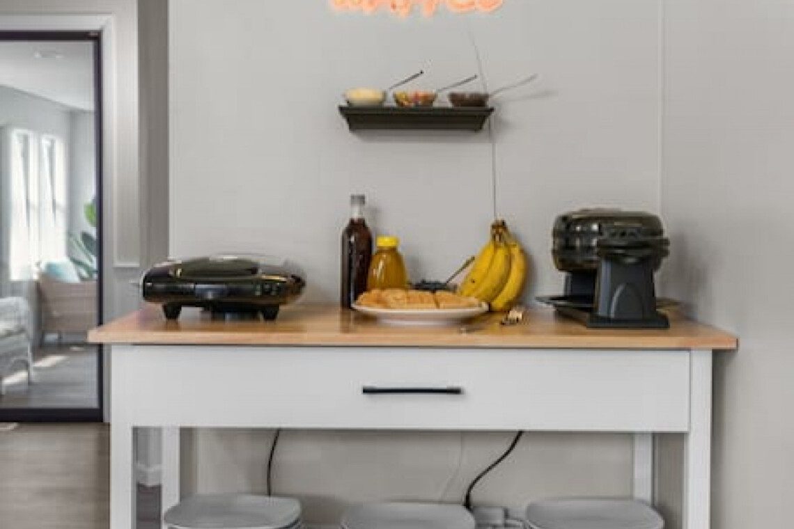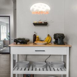 The huge kitchen and dining area has a unique waffle bar with pancake mix and syrups provided. There’s also a convection oven, pizza oven, and mini-fridge in the basement entertaining and dining area for late night meal snacks! The waffle bar is stocked with non-perishable food items including chocolate syrup, syrup and waffle mix for each guest. Feel free to bring your favorite toppings to add such as fruit, nuts, sprinkles, whip cream etc!