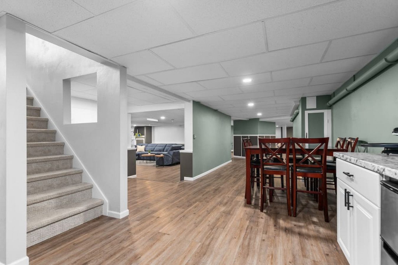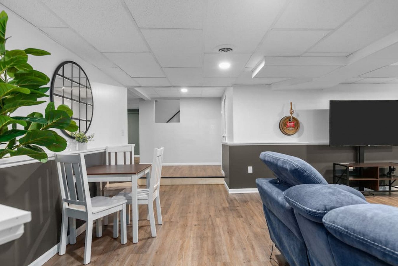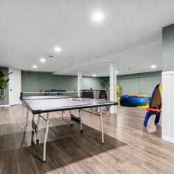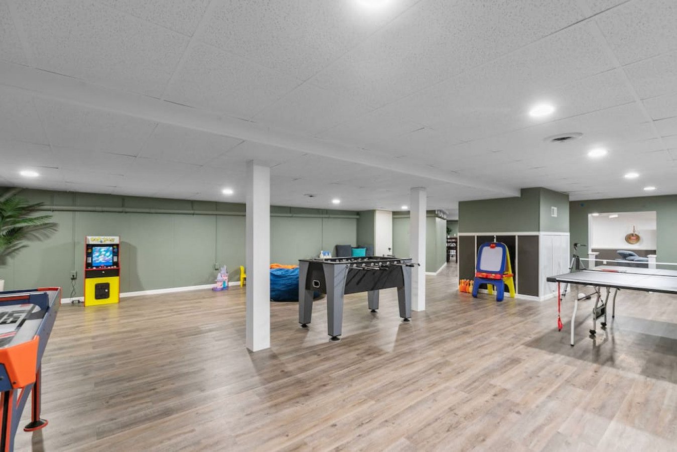 The stylish home features a game room in the basement with ping pong and air hockey tables, an arcade game, and karaoke machine that’s ideal for adults, teens and kids. Adults can enjoy drinks from the mini fridge and hang out on the reclining sectional sofa.