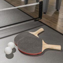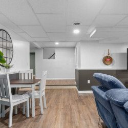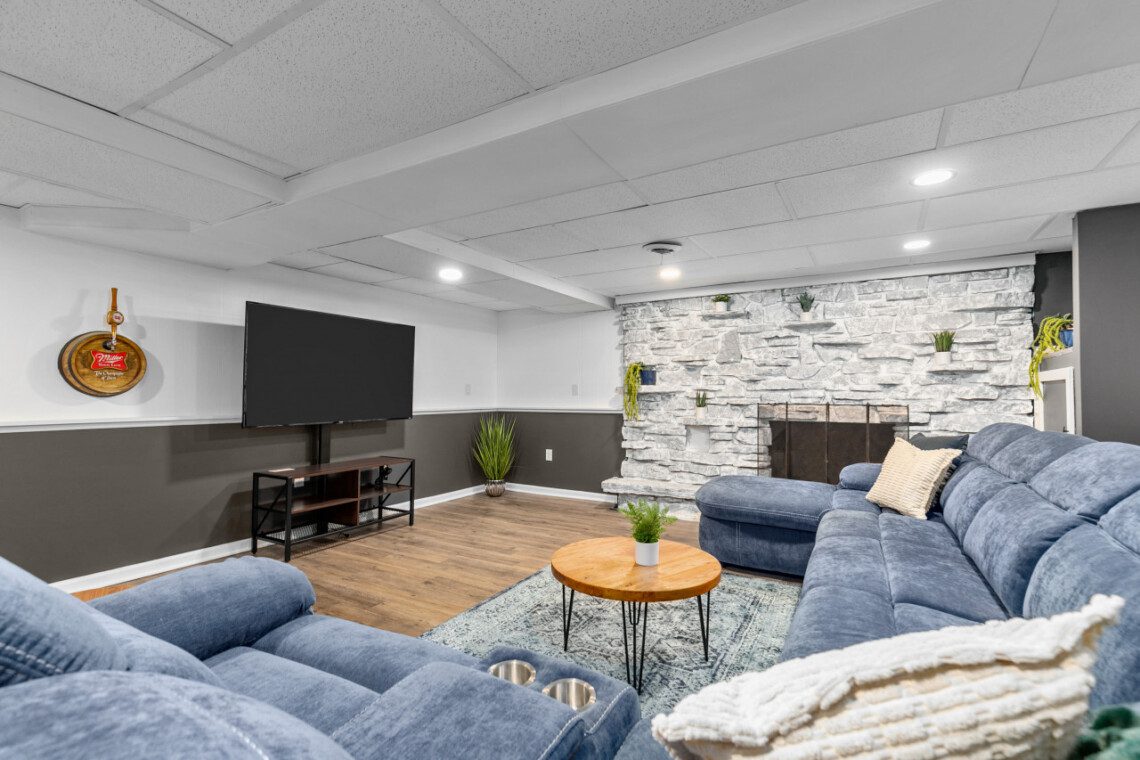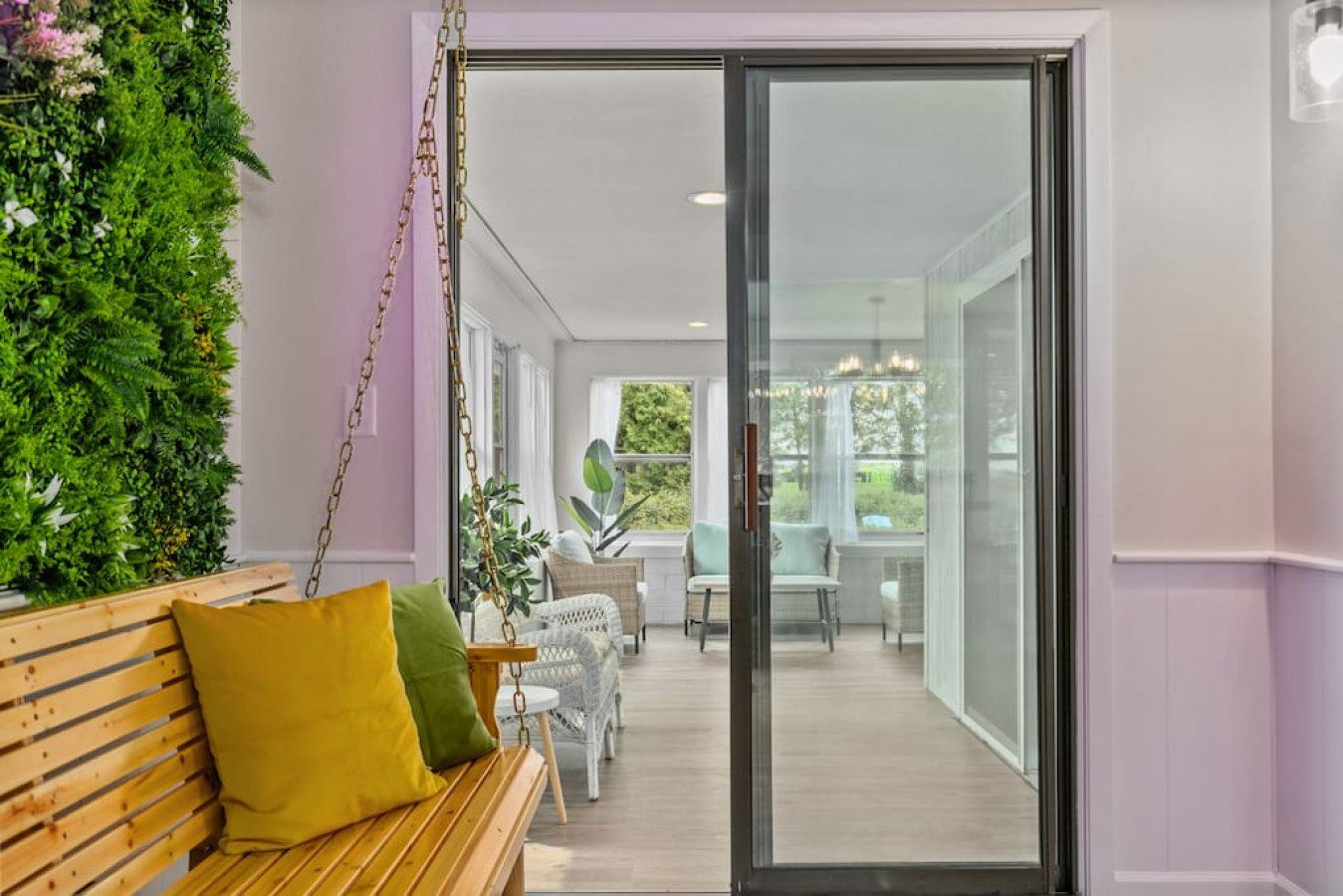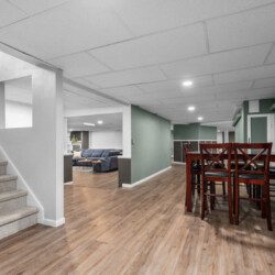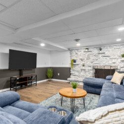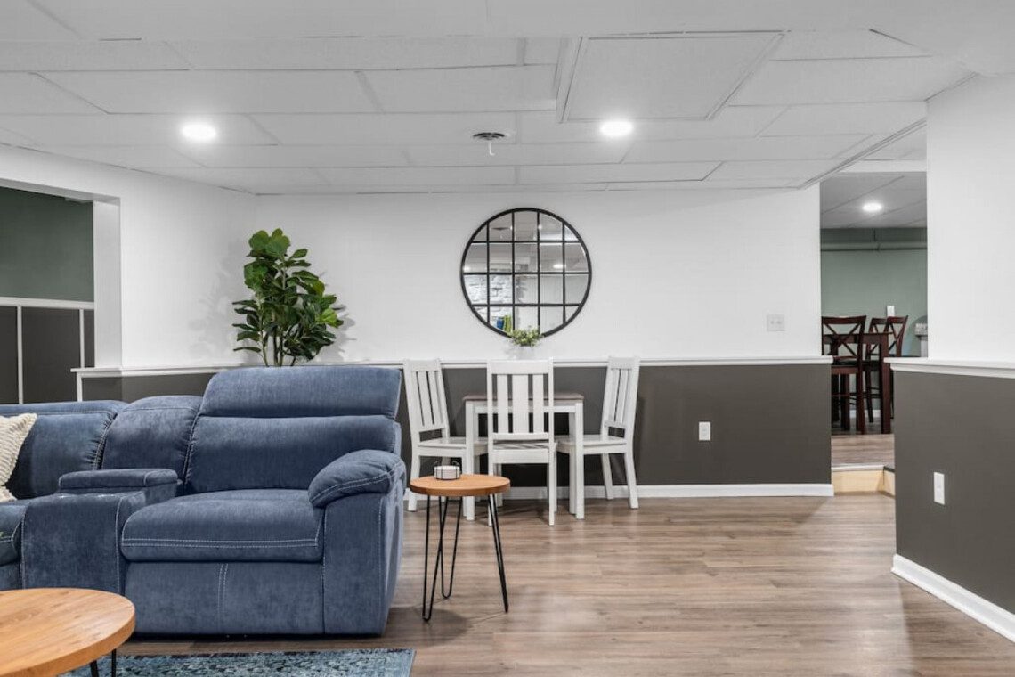 The stylish home features a game room in the basement with ping pong and air hockey tables, an arcade game, and karaoke machine that’s ideal for adults, teens and kids. Adults can enjoy drinks from the mini fridge and hang out on the reclining sectional sofa.