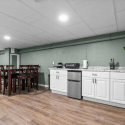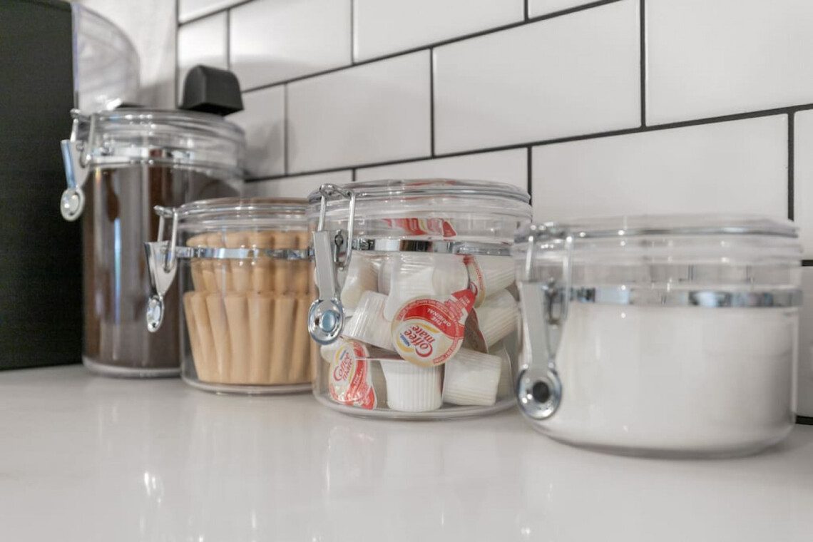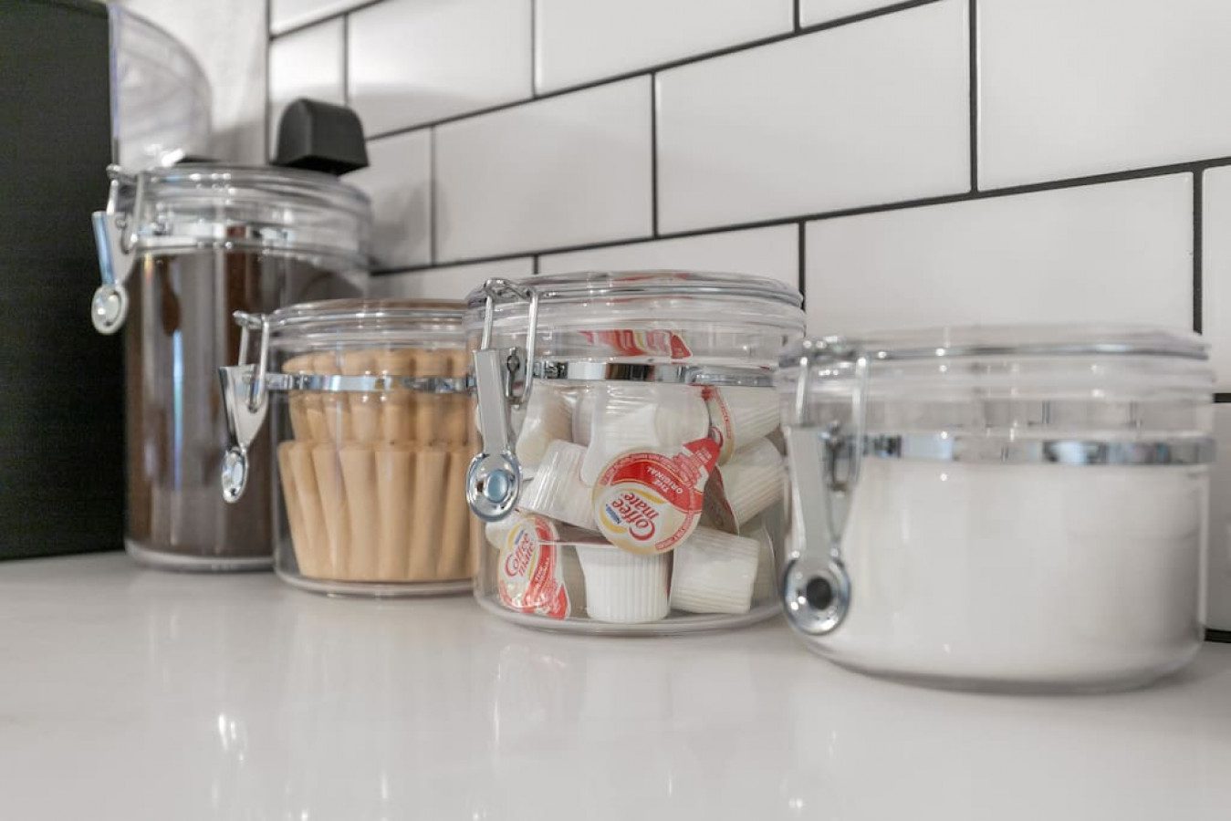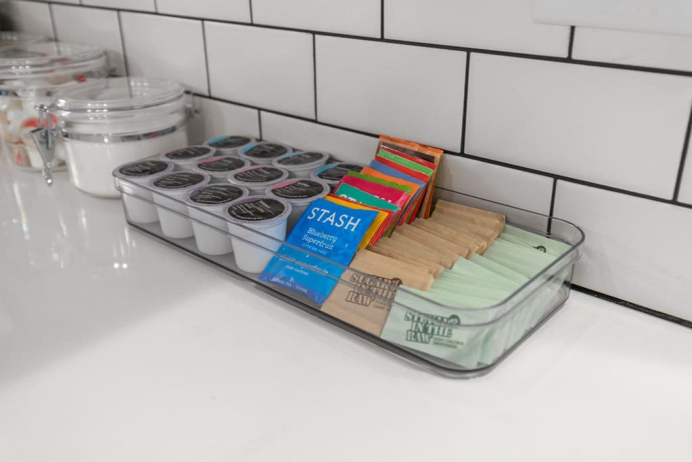 Enjoy your morning beverage of choice at the coffee and tea bar! A 12 cup coffee maker and Keurig are available, and we provide a starter set of ground coffee, k-cups, tea, creamer, sugar and stevia.