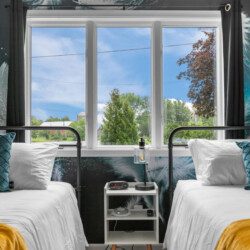 Bedroom 2: Two queen beds. Entrance requires walking through twin bunk room. 43″ Smart TV. Attached full bathroom is stocked with shampoo, conditioner and body wash. Large closet.