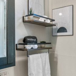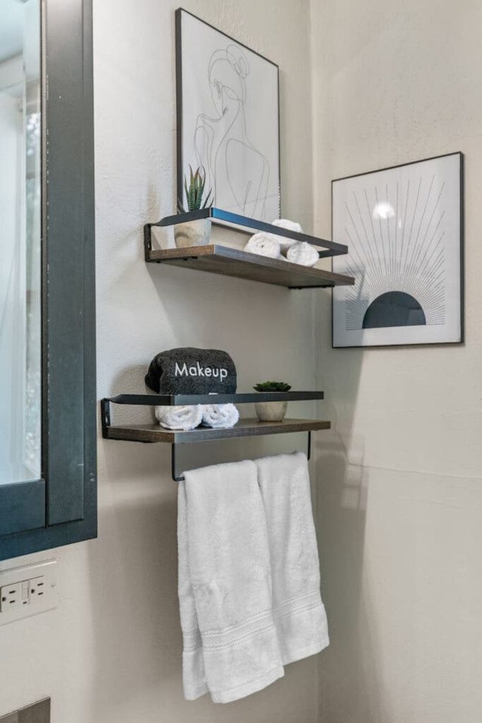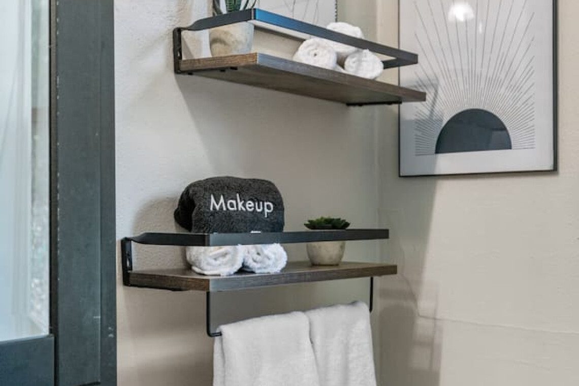 A starter set of shampoo, conditioner, and body wash are located in the shower. Makeup towels are available along with a hair dryer. A starter supply of toilet paper is provided.