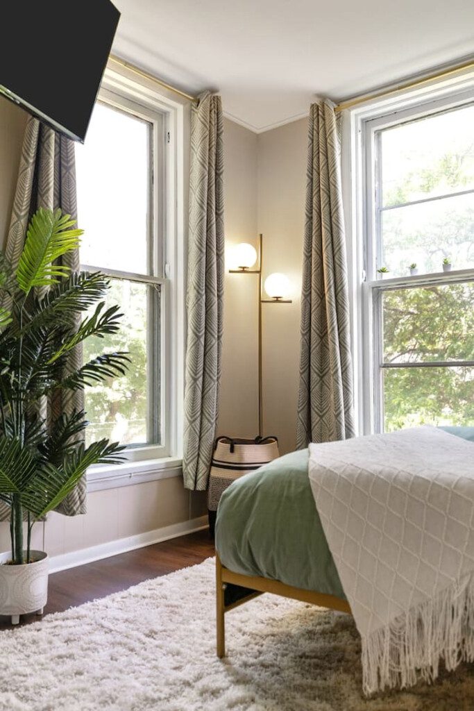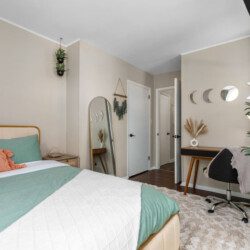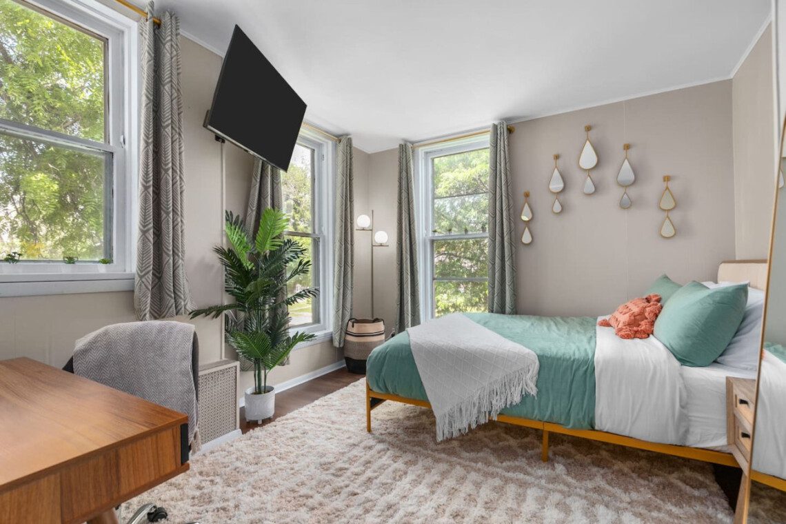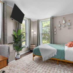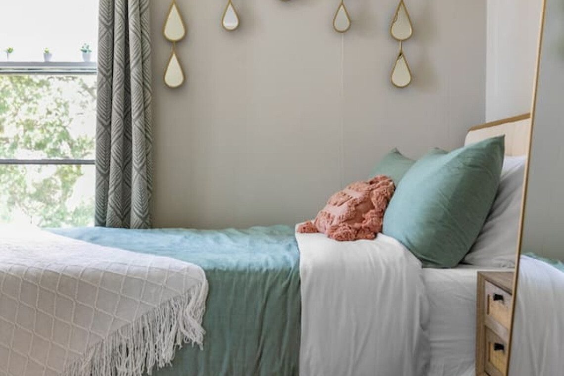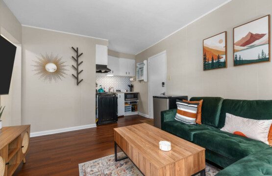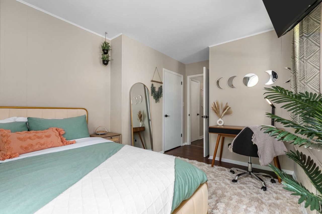 The bedroom has a new queen memory foam mattress. 43″ Smart TV. Room darkening shades have been installed for daytime sleep!