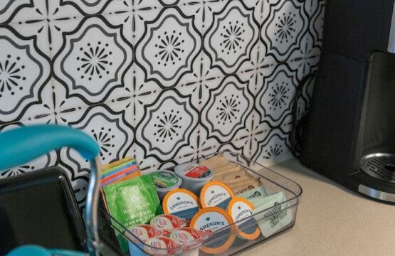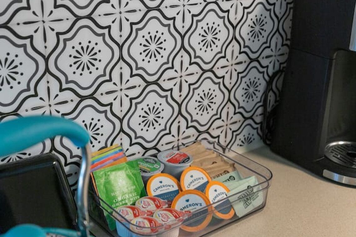 Enjoy your morning beverage of choice at the coffee and tea bar! A Keurig is available; we provide a starter set of k-cups, tea, creamer, sugar and stevia.